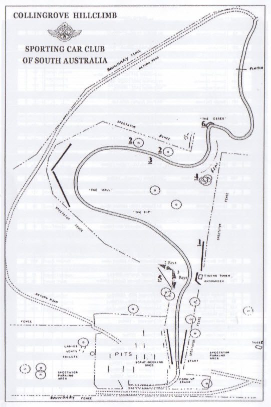 Entrants compete against the clock on either a closed section of road or on a dedicated track. As the name “Hillclimb” implies, the finish line is generally higher than the start line. This event is usually conducted over relatively short distances, but some locations offer longer tracks. Currently, the Mount Alma Mile is the longest in the state and is quite a bit faster than the track at Collingrove. The Collingrove track is 685 metres of challenging asphalt, climbing nearly 70 metres from the start to the finish, with dips, curves and undulations to test the car and the driver. It is only 3.3 metres wide. See site map
